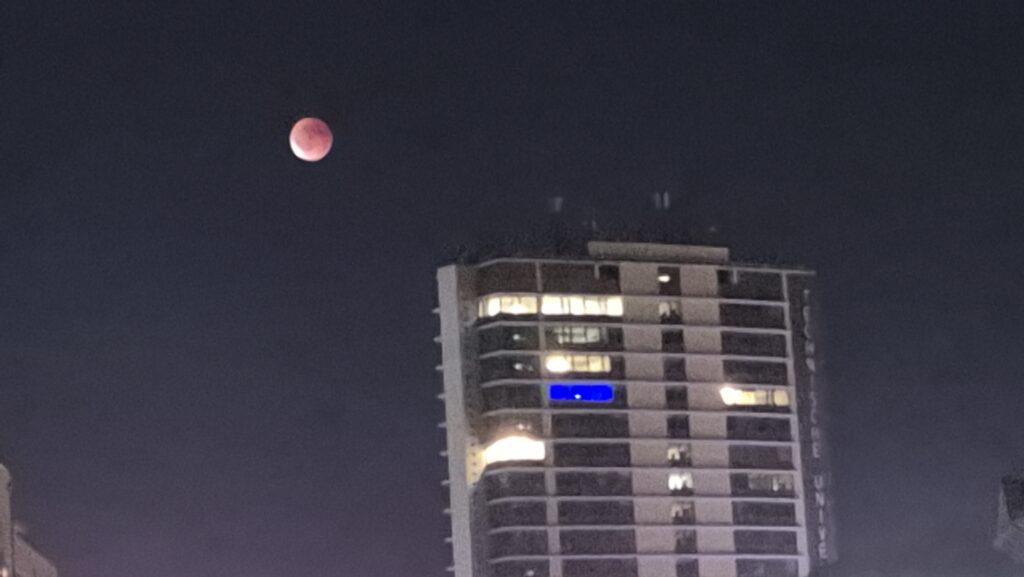 Berlin-Charlottenburg, Deutschland – nein hier fliegt keine große Eichel über Berlin, sondern so sieht der Mond mit enormer Vergrößerung aus; die linke Hälfte ist schon nicht mehr im Erdschatten / No, there isn’t a large acorn flying over Berlin, but rather this is what the moon looks like when greatly magnified; the left half is no longer in the Earth’s shadow.